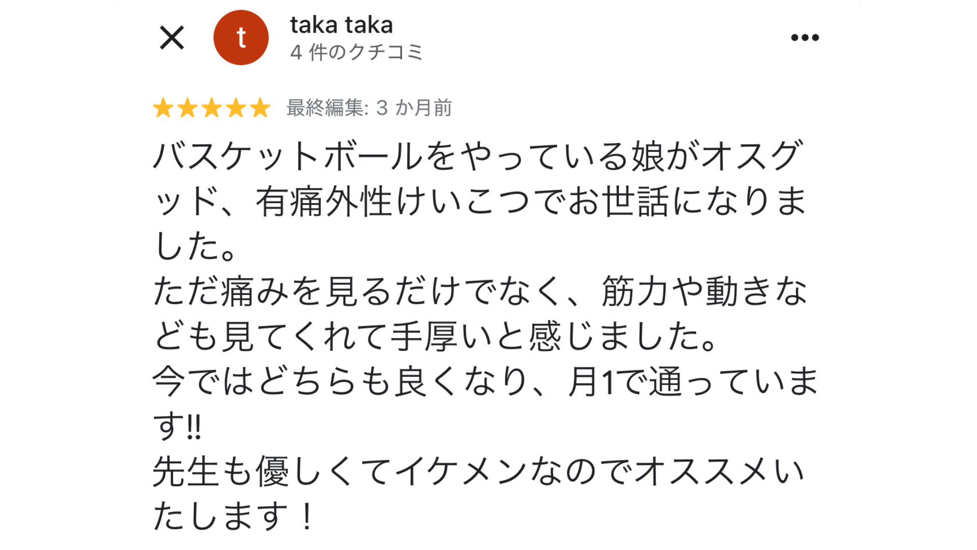 まず驚いたのが的確に根本原因を探して再発まで予防してしまう技術に驚かされました。しかし、私のお薦めする1番の理由は、金子先生の素晴らしい人柄です。とても優しく温かい人物です。