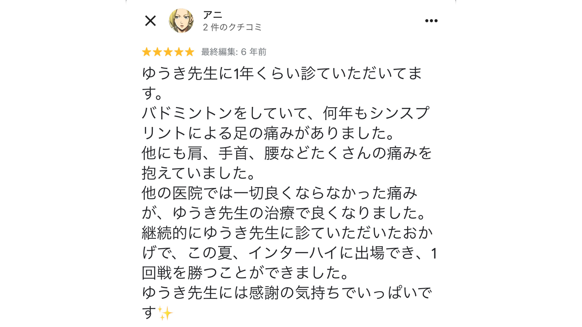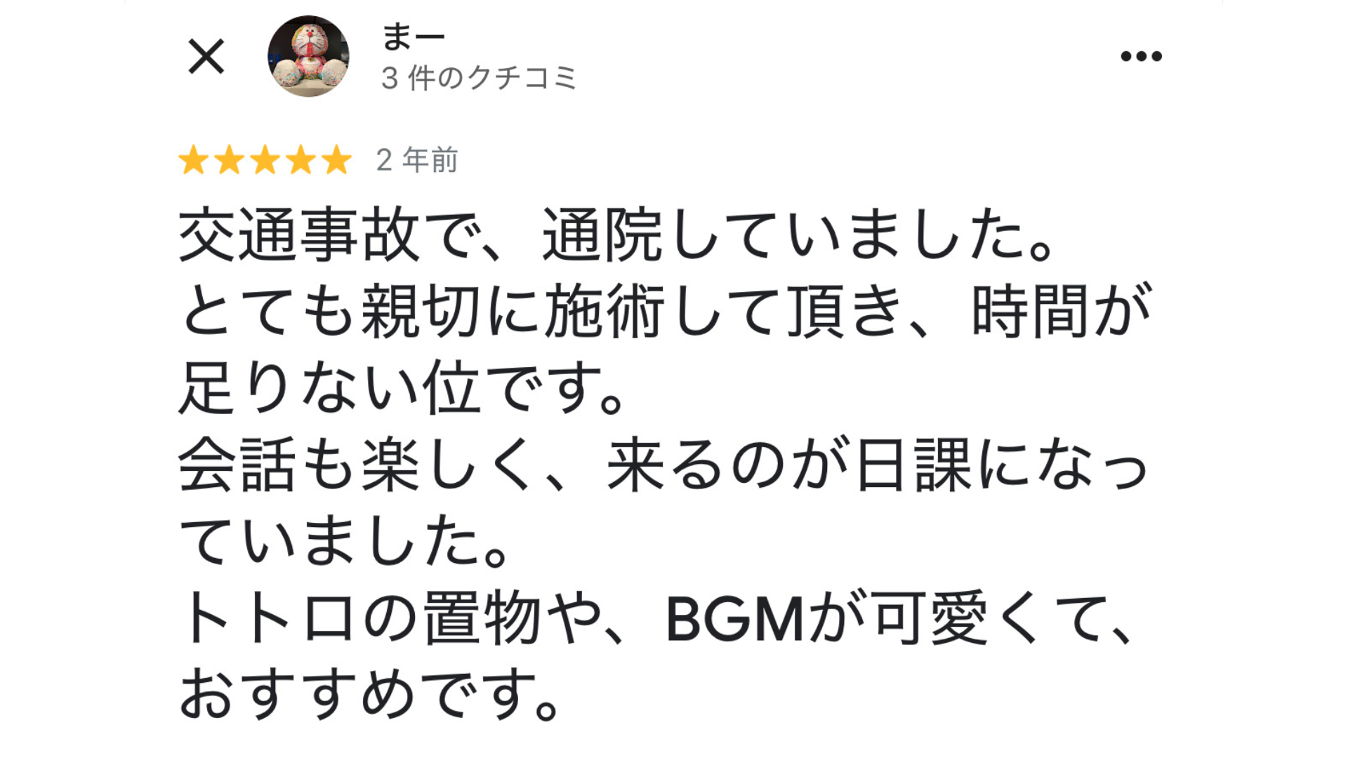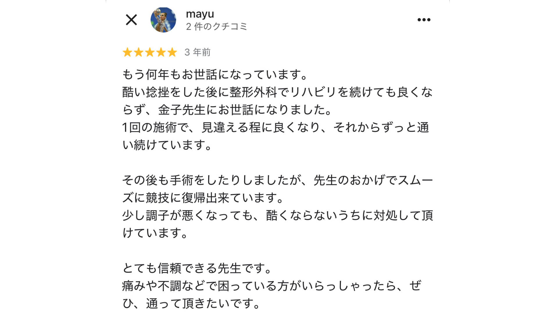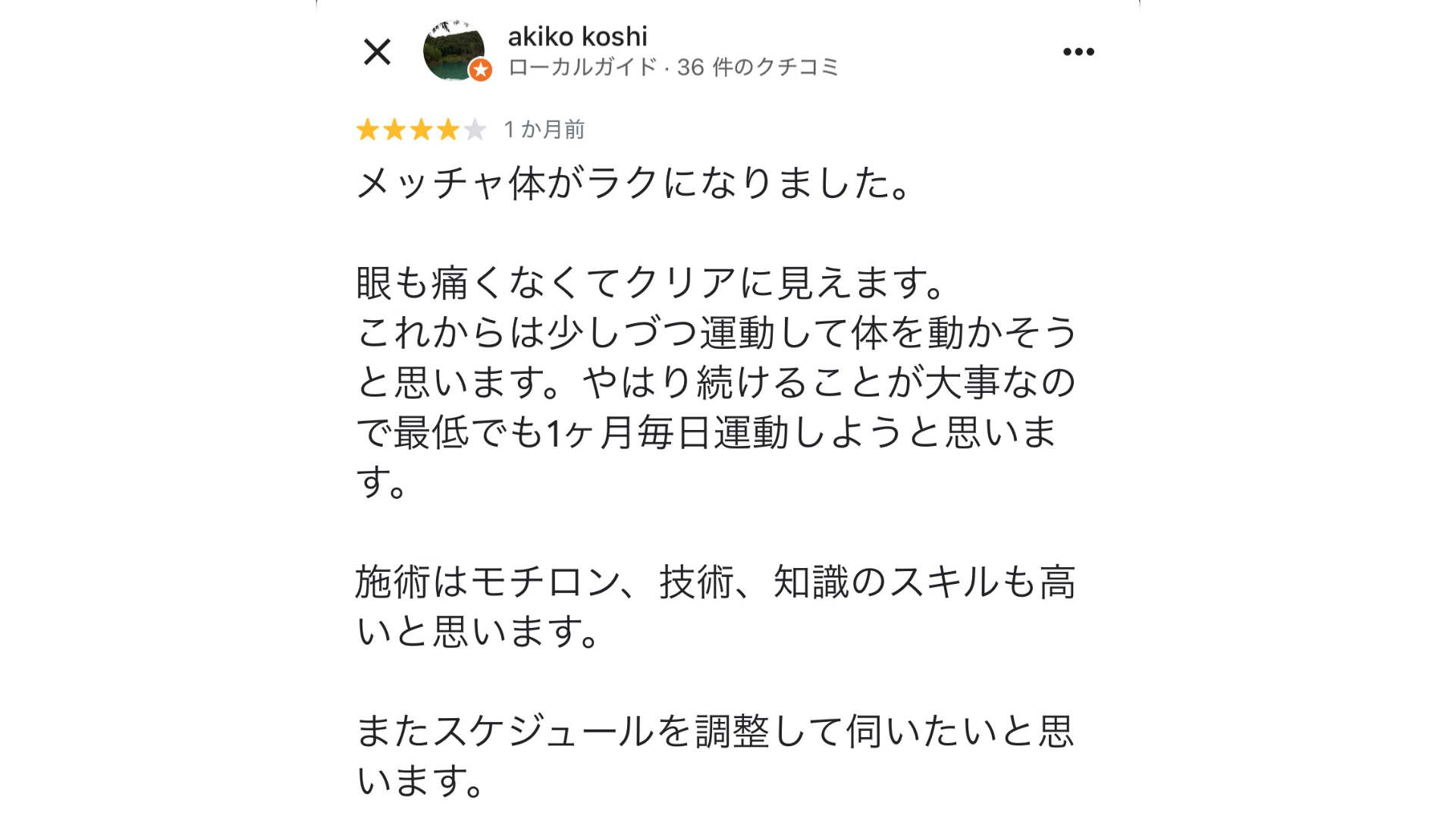 症状に対して根本原因を丁寧に説明してくれるので、圧倒的に改善が速いです。その場限りの施術ではなく、回数を重ねるたびに体が楽になる実感がわきます。